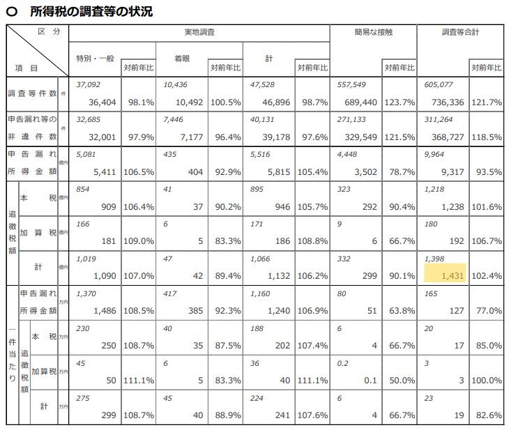 その結果、「実地調査」と「簡易な接触」を合わせた調査等による追徴税額の総額は、1,431億円(前事務年度比2.4%増)で過去最高を更新しました。