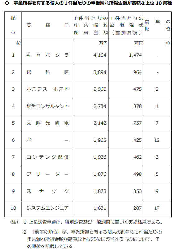 事業所得を有する個人の1件当たりの申告漏れ所得金額が高額な上位3業種は「キャバクラ」、「眼科医」、「ホステス、ホスト」の順でした。