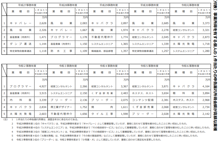 個人事業者の1件当たり申告漏れ所得金額では「キャバクラ」「眼科医」「ホステス・ホスト」が上位を占め、業種ごとの調査重点が年ごとに変化している様子がうかがえます。